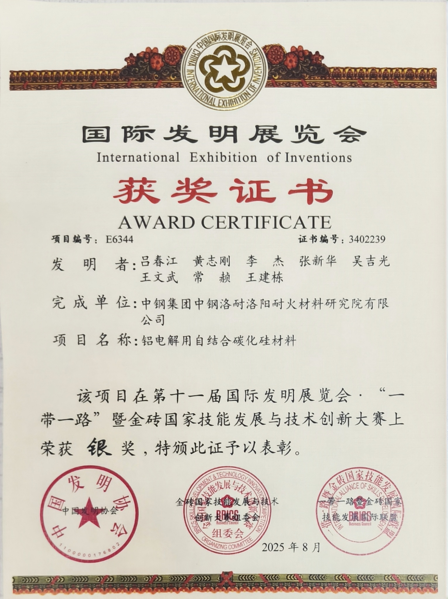 中鋼洛耐兩項創新成果斬獲第十一屆國際發明展覽會暨 “一帶一路” 暨金磚國家技能發展與技術創新大賽銀獎